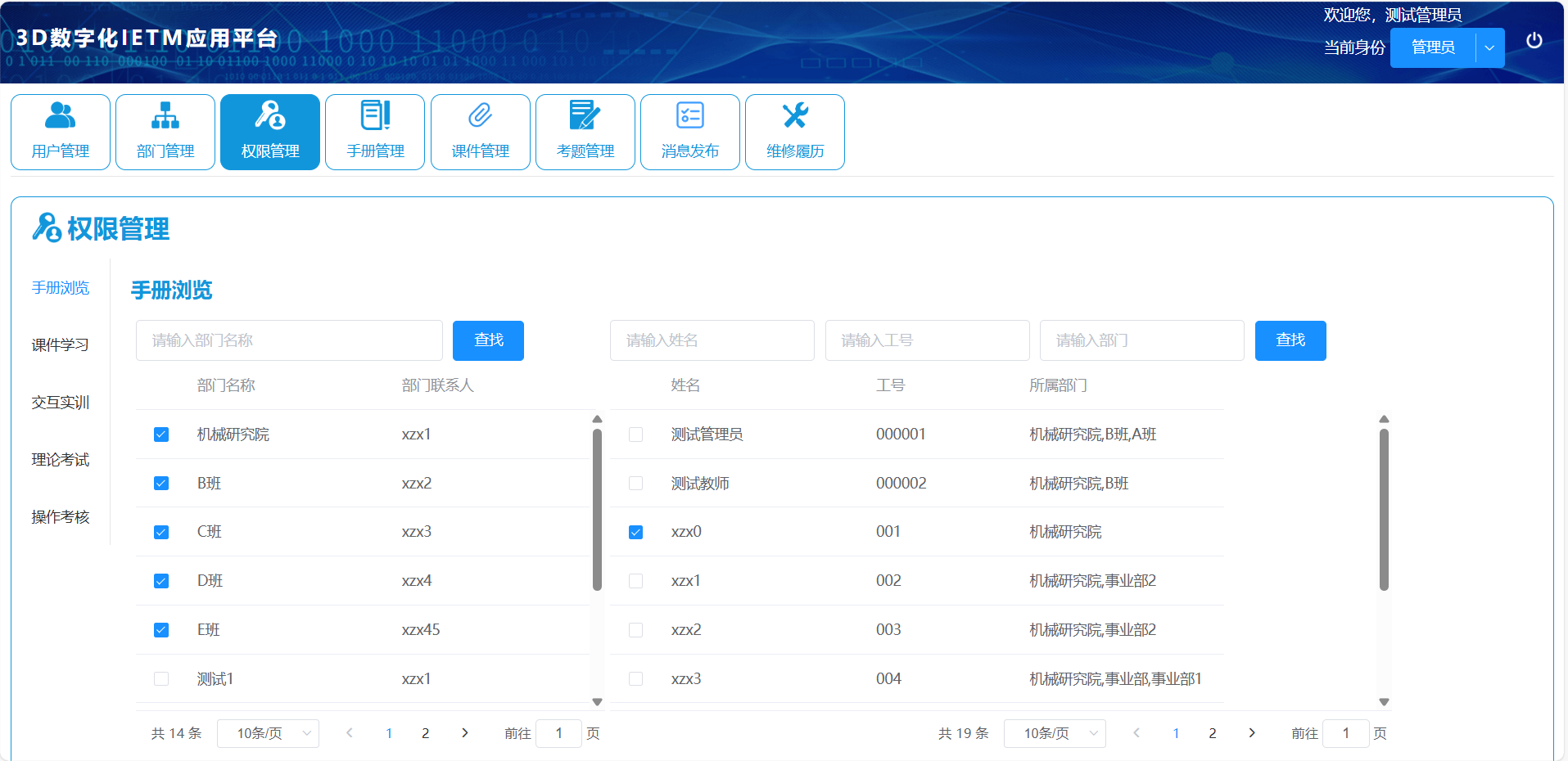 3D数字化手册线上应用平台集手册查询与浏览、交互训练与考核等功能为一体。不仅支持线上交互实训还可进行组织考试、控制考试过程、收集考试结果,还能进行组织机构与人员的统一管理。