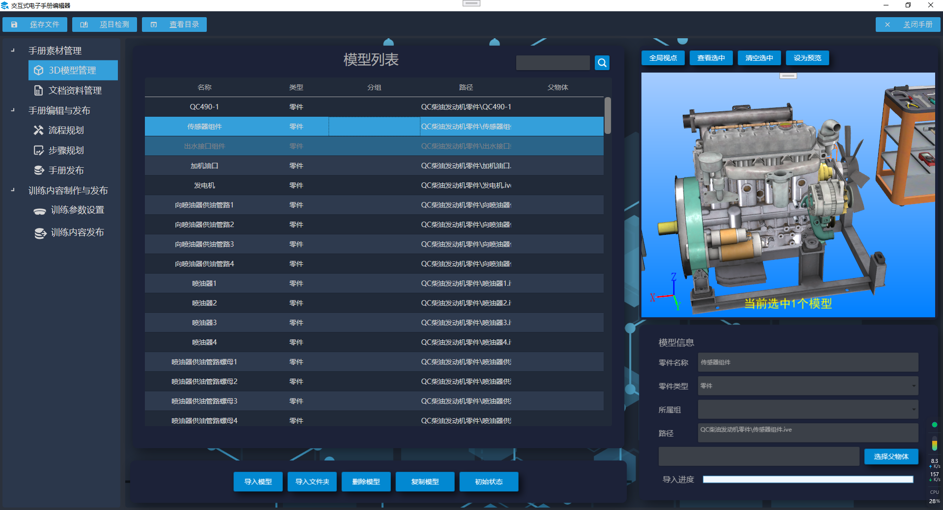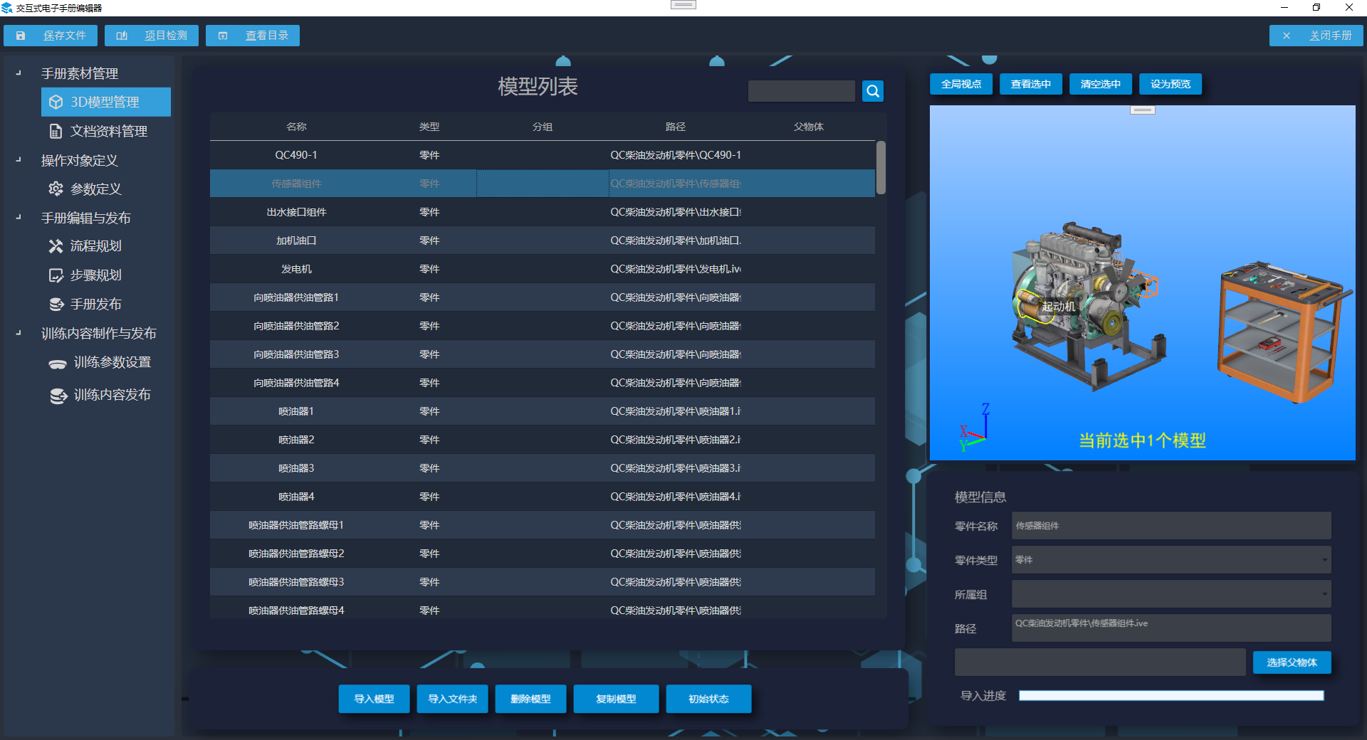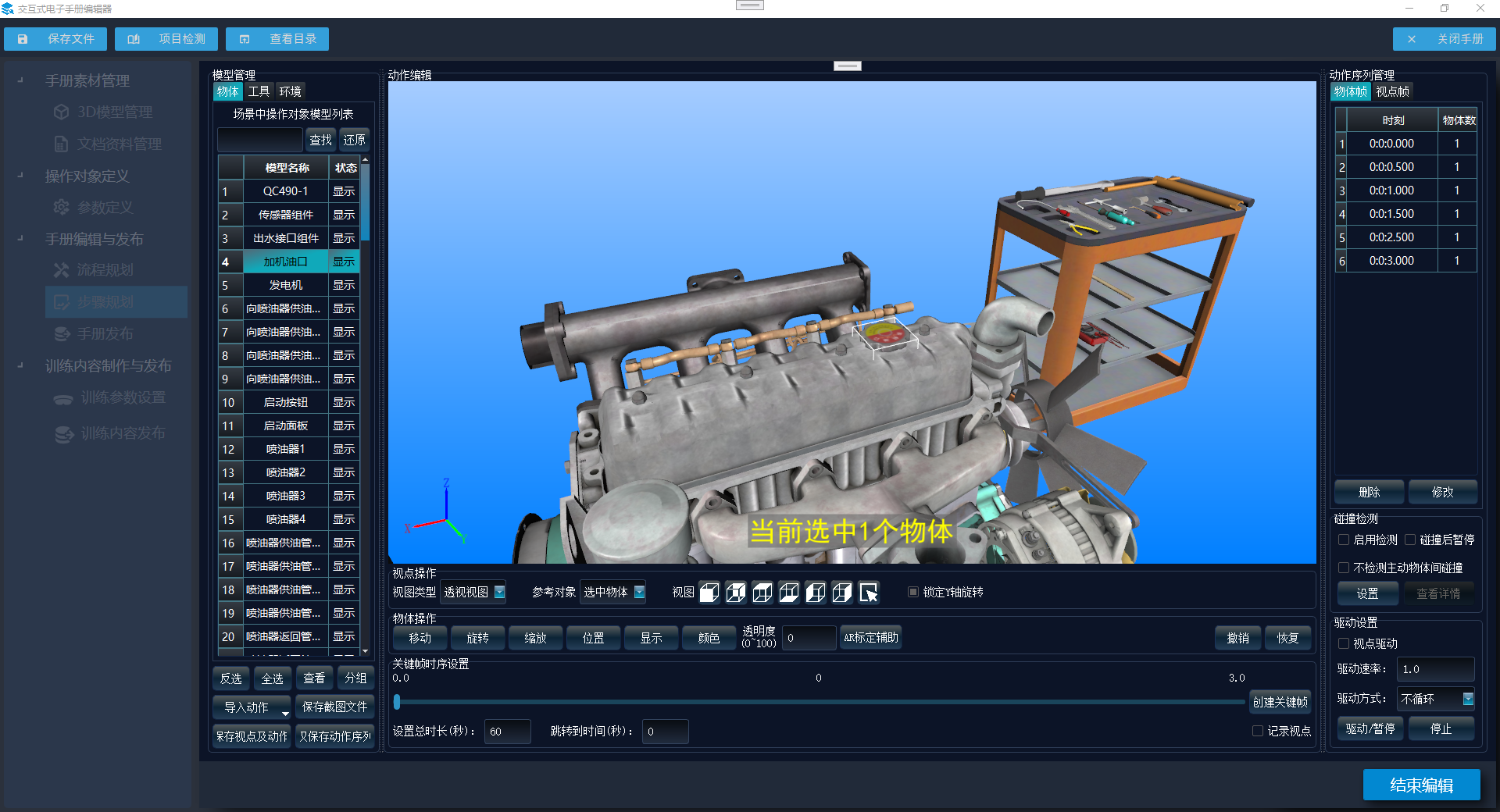 3D电子交互手册编辑工具提供一个通用的设备与产品电子手册创建与编辑环境,将操作对象的结构组成、操作流程及相关资料以数字化的方式进行组织与呈现,生成电子交互手册文件包,为各类电子手册应用软件提供数据来源。