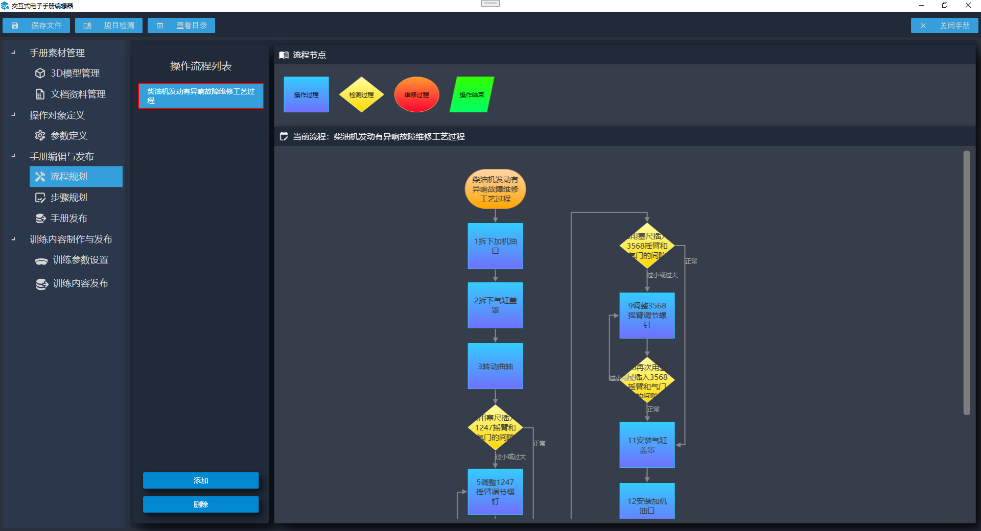 软件能够导入3D模型、图片、PDF文档、视频等手册素材,通过图形化界面搭建业务的执行流程,定义流程中的详细操作步骤,包括操作对象、操作规范、注意事项等,并在3D模型基础上进行三维工艺动作规划,形成支持交互操作的3D电子手册,支持发布成PC、移动设备、网页版的数据包。