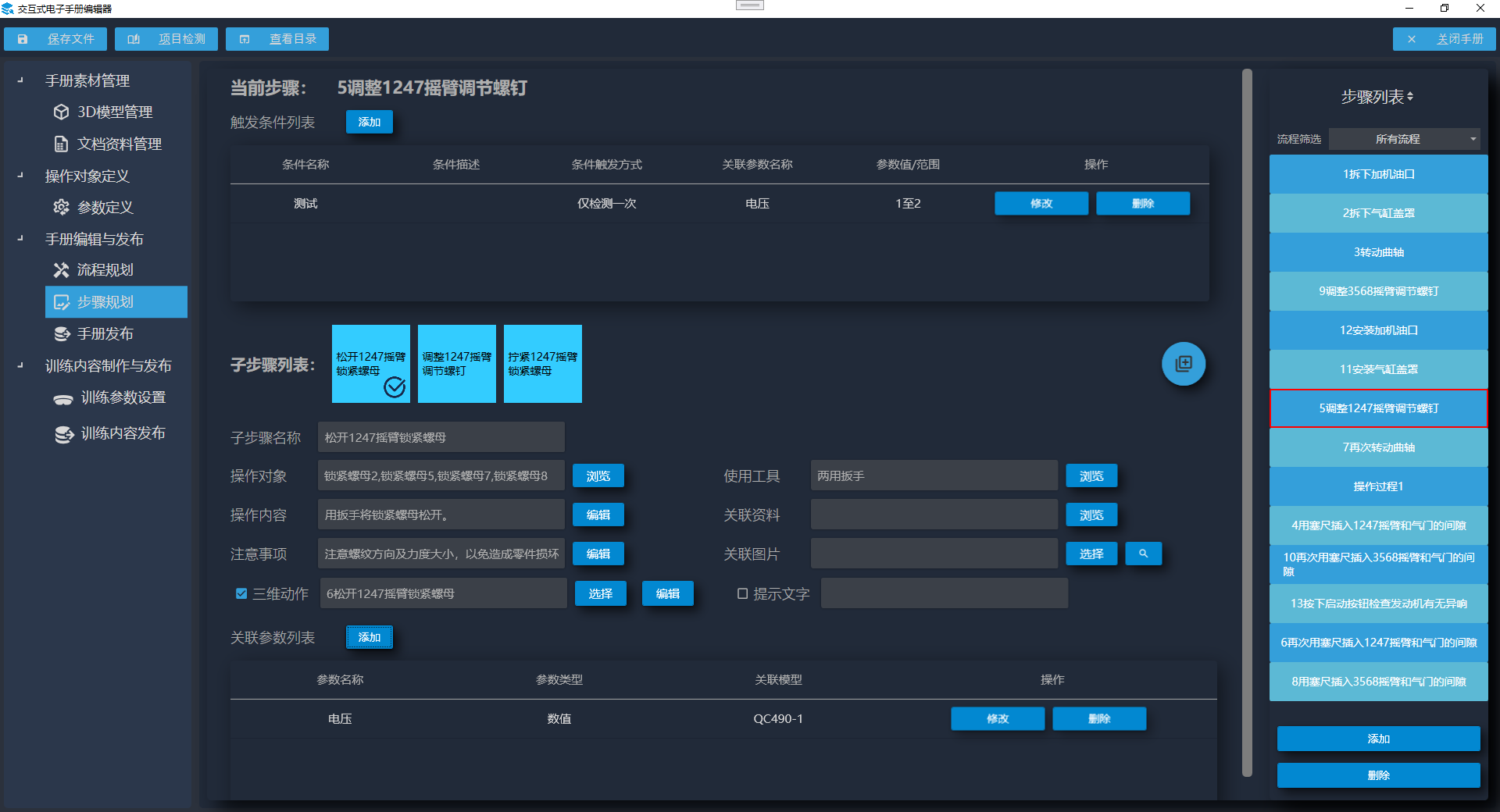 将操作流程节点进一步细化为操作步骤,设置每个步骤的操作对象、使用工具、操作内容、注意事项、关联资料等内容 。