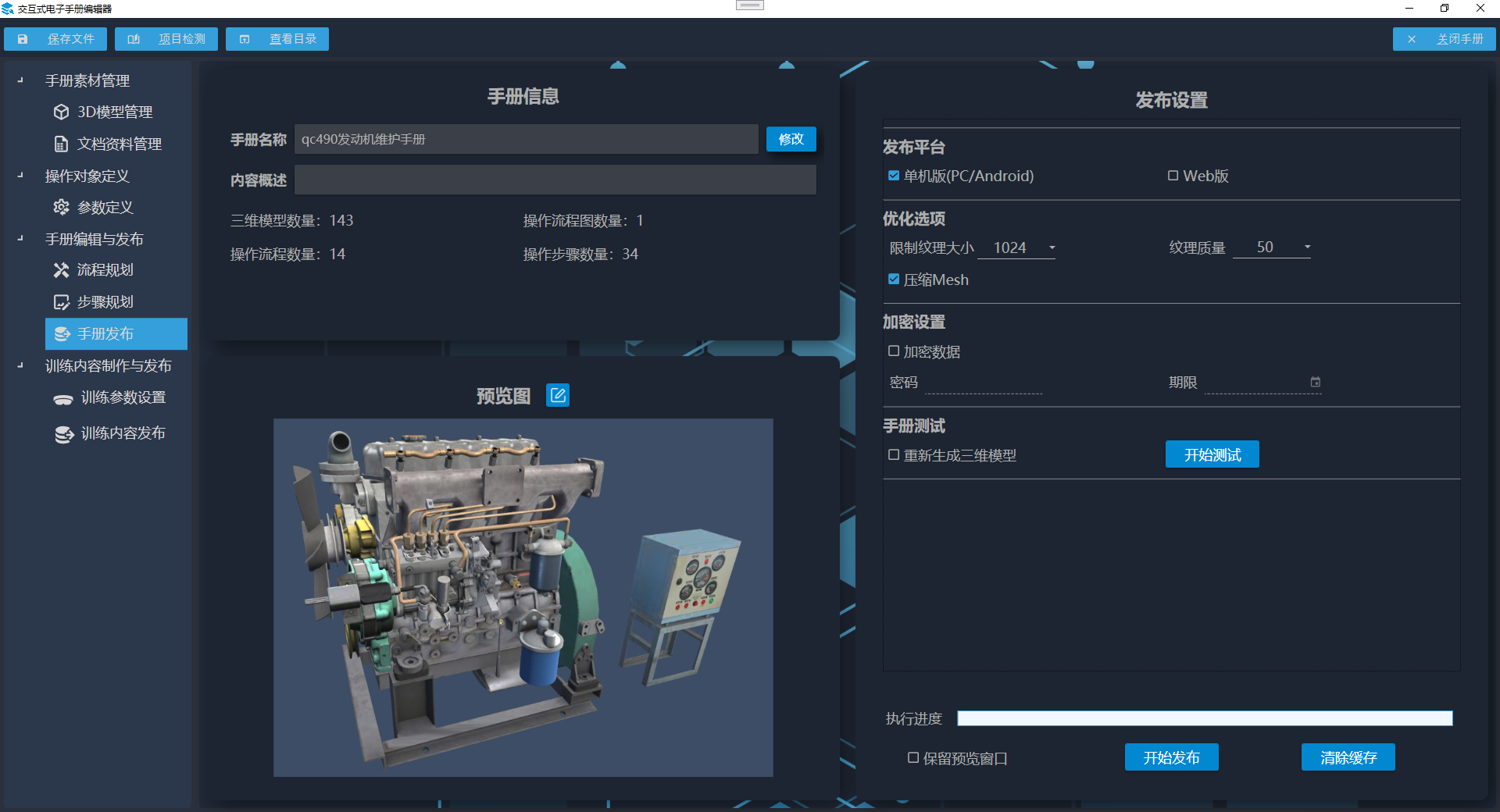 将编辑完成的电子手册数据进行打包,并针对移动平台、网页端等终端进行优化,发布成3D电子手册数据包,支持对数据进行加密与压缩。